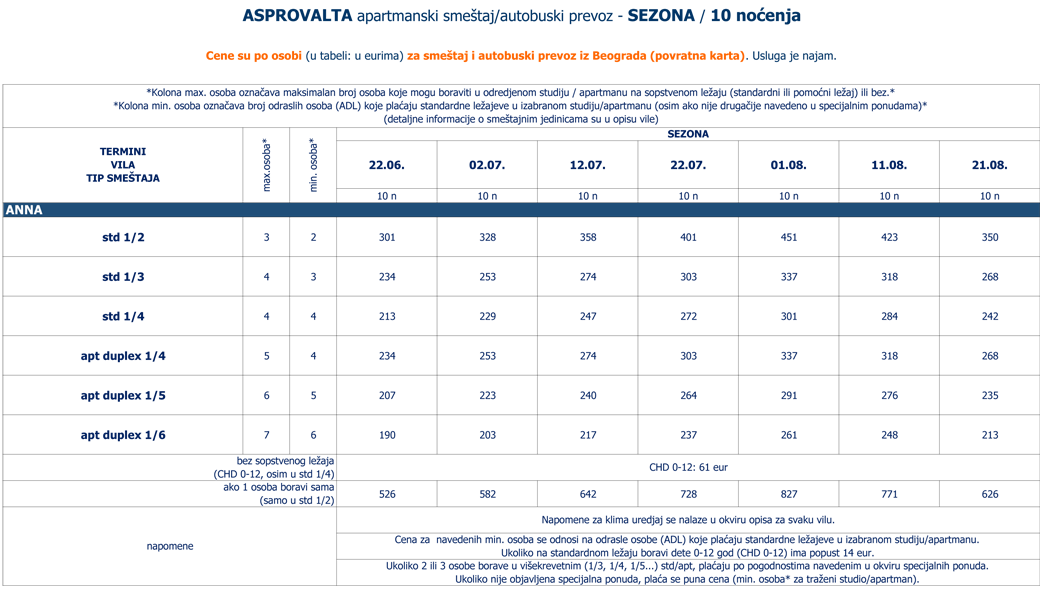Ukoliko jedna osoba boravi sama u 1/3+1, 1/4, 1/5, 1/6... std/apt plaća 2 cene iz kolone broj osoba za 3 ADL: 1 cenu iz tabele za autobuski i 1 iz tabele za sopstveni prevoz. |