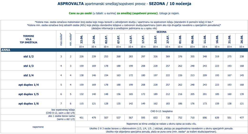(cene za jednokrevetne std/apt, cene za odrasle (ADL) na pomoćnom ležaju i cene za decu (CHD) na sopstvenom (standardnom ili pomoćnom) ležaju ili bez su navedene u okviru POPUSTA i DOPLATA) |