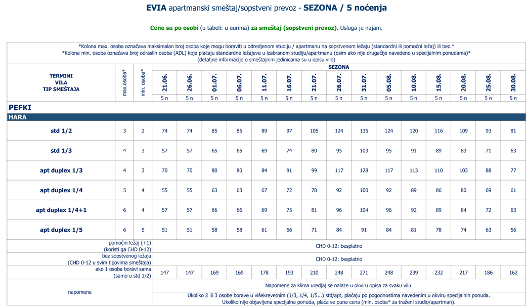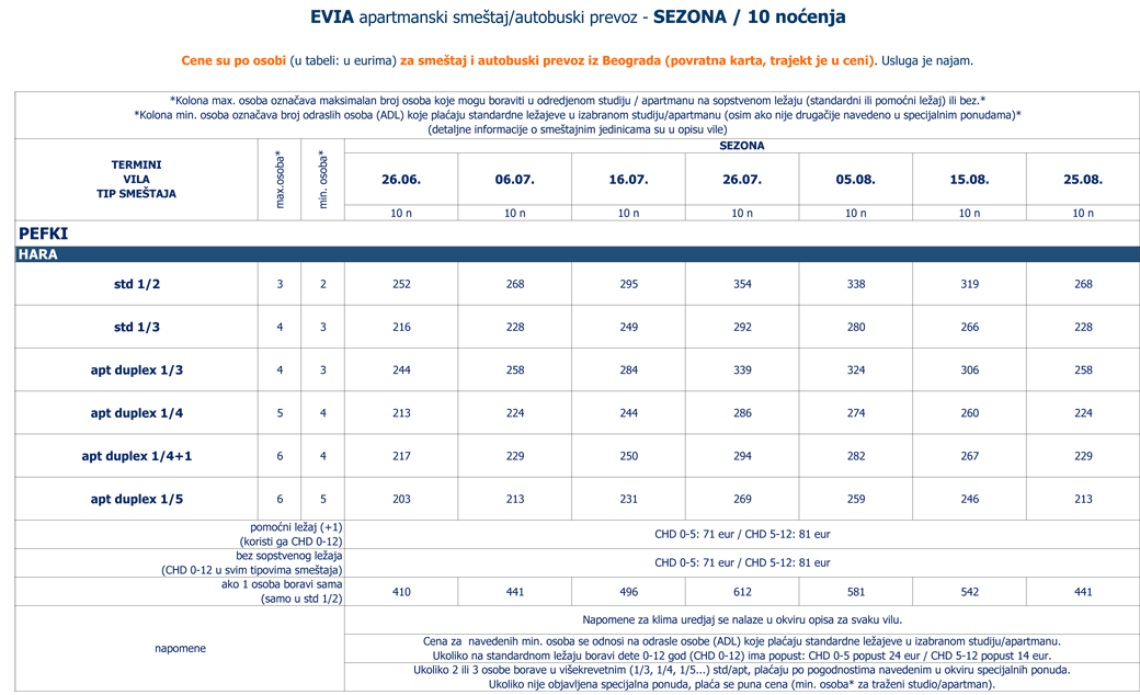Cene su po osobi (u tabeli: u eurima) za smeštaj i autobuski prevoz iz Beograda (povratna karta, trajekt je u ceni).