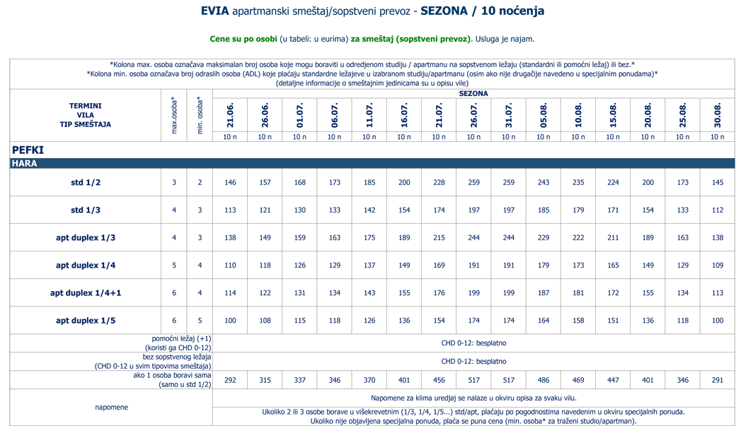 (cene za jednokrevetne std/apt, cene za odrasle (ADL) na pomoćnom ležaju i cene za decu (CHD) na sopstvenom (standardnom ili pomoćnom) ležaju ili bez su navedene u okviru POPUSTA i DOPLATA)