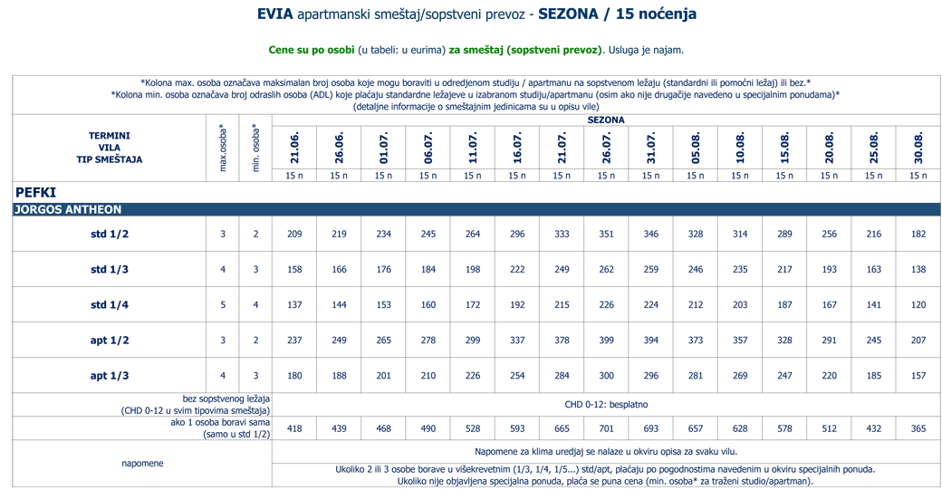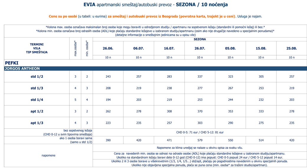 Cene su po osobi (u tabeli: u eurima) za smeštaj i autobuski prevoz iz Beograda (povratna karta, trajekt je u ceni).
