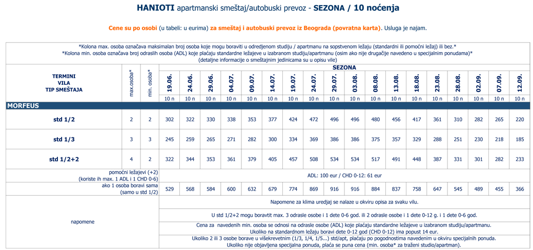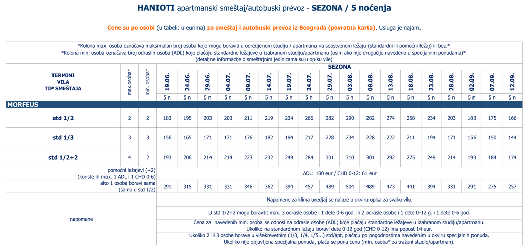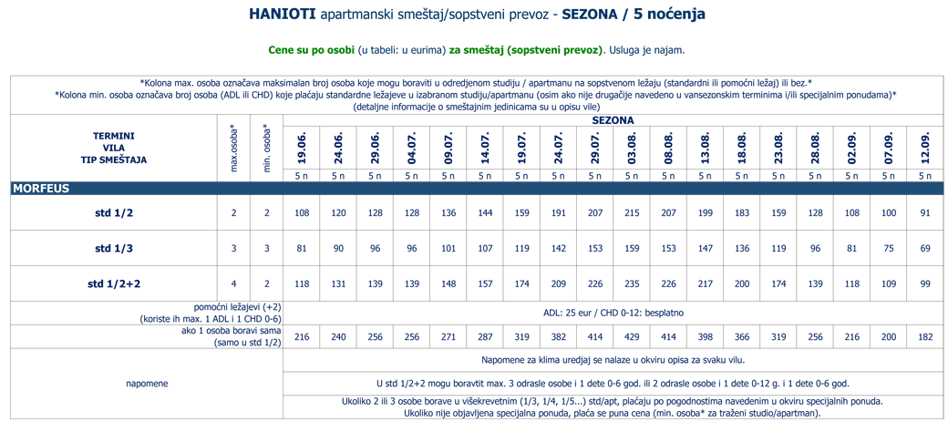 Vila u kojoj vlasnici obraćaju pažnju na svaki detalj, izvanredno održavaju i vode računa o besprekornoj čistoći i uživanju gostiju u miru i tišini. Nalazi se u novom delu letovališta, oko 200 metara od gradskog trga. U neposrednoj blizini se nalazi velika samoposluga Masutis, sportski tereni, kao i igralište za decu. Vila Morfeus, jedna od najboljih u Sabrinoj ponudi, udaljena je oko 380 metara od plaže, a u sklopu vile se nalazi travnati vrt sa mediteranskim cvećem i fontanom, recepcija sa lobijem i barom. Studiji su idealni za porodice sa decom, ali i za parove i mlade. Dvokrevetni, dvokrevetni + 2 i trokrevetni studiji se nalaze na prizemlju sa direktnim izlaskom u vrt, prvom i drugom spratu i sastoje se od velikog prostora u kojem je smeštena opremljena kuhinja, dva spojena ležaja i sofa na otvaranje (za odraslu osobu i dete ili dvoje dece do 12 godina), kupatila i velike terase s garniturom za sedenje. Svi studiji su sa klima uredjajem (uračunat u cenu 24.07. - 18.08., u ostalim terminima se doplaćuje na licu mesta (opcija), 6 eur dnevno po studiju), LED TV-om 28 inča (RTS) i wi – fi Internetom (uz doplatu na licu mesta (opcija) 2 eura dnevno). Veličina studija je cca 25 kvm + terasa. Vila Morfeus je visoke A kategorije i nema mogućnost sopstvenog parkinga, ali je veliki besplatni parking u neposrednoj blizini. Svake godine se u vili uradi nešto novo i ulažu sredstva u održavanje i poboljašnje kvaliteta (delimično renoviranje studija i kupatila: ugradjene staklene kabine za tuširanje i promenjena vrata od kupatila, novi televizori, kreveti (sa ortopedskim madracima), kompletno posudje, posteljina, jastuci i ćebad, garnitura za sedenje na terasi...). Ugradjena je i dodatna pumpa za pritisak vode, kako tokom sezone ne bi dolazilo do nestašice vode u popodnevnim i večernjim satima. Vila Morfeus pruža sve uslove za SABRA, 100% ODMOR. Preporuka za one koji žele najbolje. |