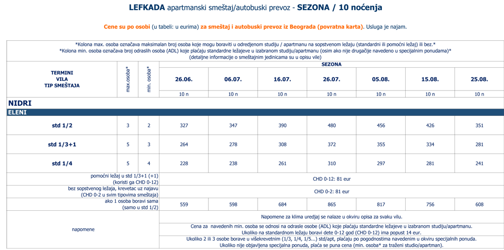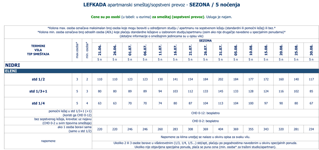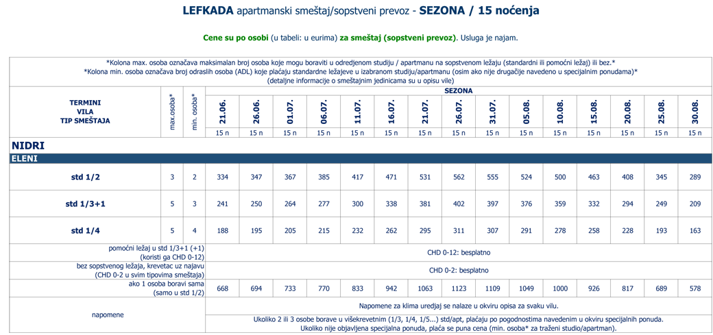 Navedene cene se odnose na sve vile iz ponude izabranog mesta. Smeštaj u odredjenoj vili i tipu smeštaja zavisi od raspoloživih kapaciteta u momentu prodaje. Tipovi smeštaja (npr. studio, apartman, duplex, prizemlje, pogled more itd.) i maksimalan broj osoba (odraslih i/ili dece do odredjenog uzrasta) koje mogu boraviti u jednoj smeštajnoj jedinici su navedeni u okviru opisa i zvaničnog cenovnika za sezonu (pojedinačno za svaku vilu). |