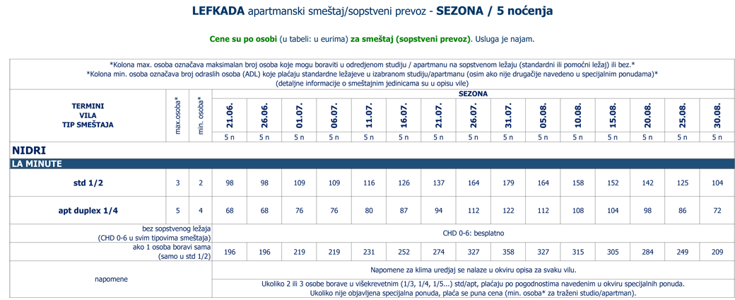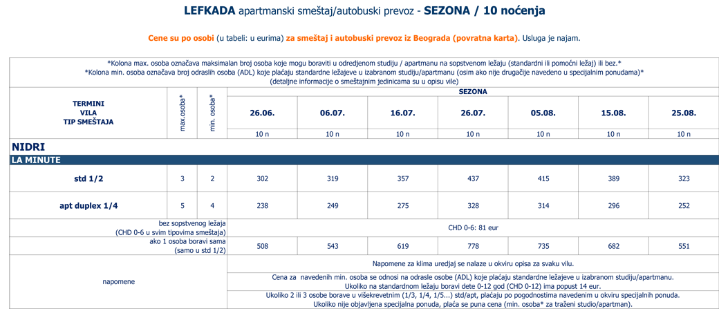 Ukoliko jedna osoba boravi sama u 1/3+1, 1/4, 1/5, 1/6... std/apt plaća 2 cene iz kolone broj osoba za 3 ADL: 1 cenu iz tabele za autobuski i 1 iz tabele za sopstveni prevoz. |