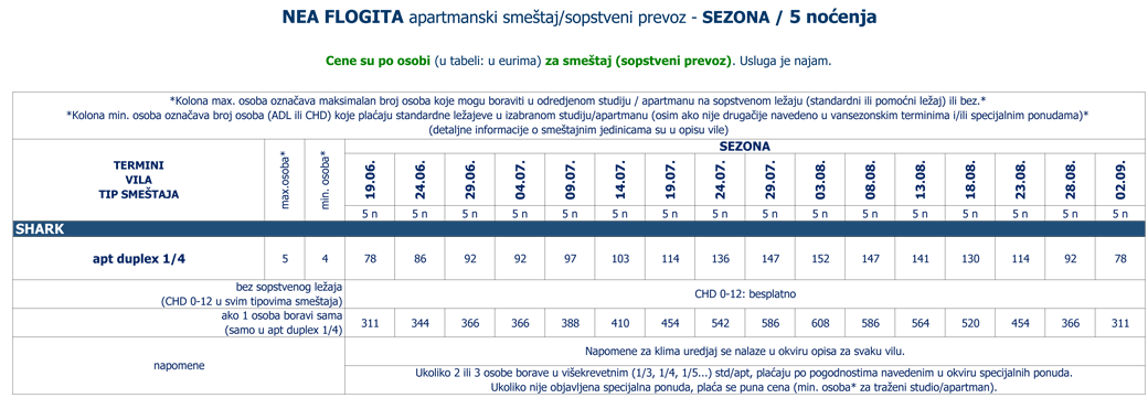 Navedene cene se odnose na sve vile iz ponude izabranog mesta. Smeštaj u odredjenoj vili i tipu smeštaja zavisi od raspoloživih kapaciteta u momentu prodaje. Tipovi smeštaja (npr. studio, apartman, duplex, prizemlje, pogled more itd.) i maksimalan broj osoba (odraslih i/ili dece do odredjenog uzrasta) koje mogu boraviti u jednoj smeštajnoj jedinici su navedeni u okviru opisa i zvaničnog cenovnika za sezonu (pojedinačno za svaku vilu). |
