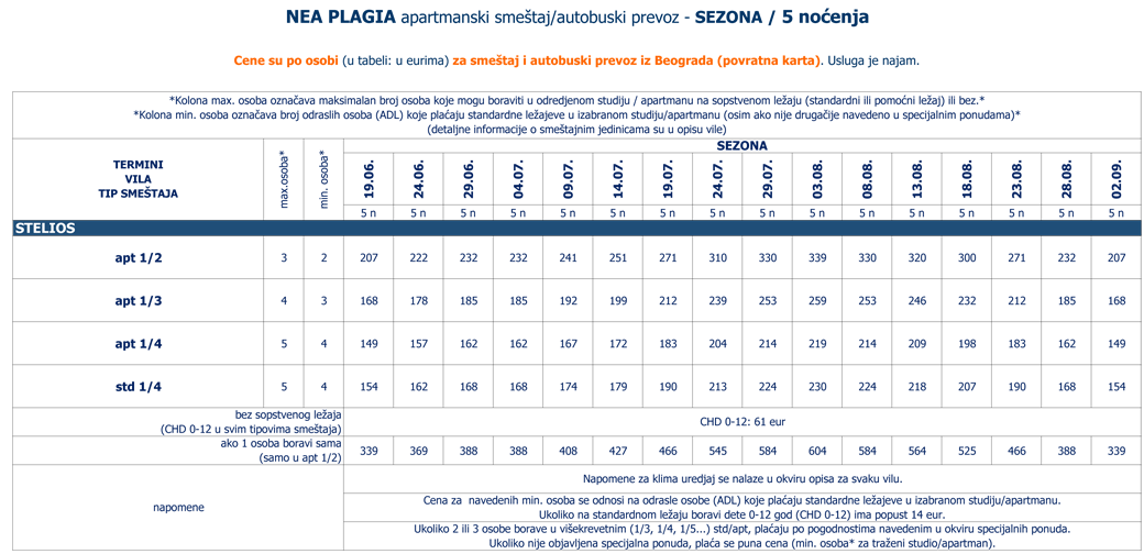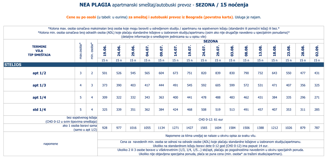 Ukoliko jedna osoba boravi sama u 1/3+1, 1/4, 1/5, 1/6... std/apt plaća 2 cene iz kolone broj osoba za 3 ADL: 1 cenu iz tabele za autobuski i 1 iz tabele za sopstveni prevoz.
