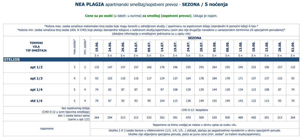 Navedene cene se odnose na sve vile iz ponude izabranog mesta. Smeštaj u odredjenoj vili i tipu smeštaja zavisi od raspoloživih kapaciteta u momentu prodaje. Tipovi smeštaja (npr. studio, apartman, duplex, prizemlje, pogled more itd.) i maksimalan broj osoba (odraslih i/ili dece do odredjenog uzrasta) koje mogu boraviti u jednoj smeštajnoj jedinici su navedeni u okviru opisa i zvaničnog cenovnika za sezonu (pojedinačno za svaku vilu).