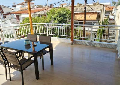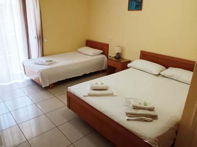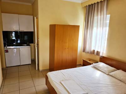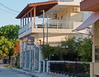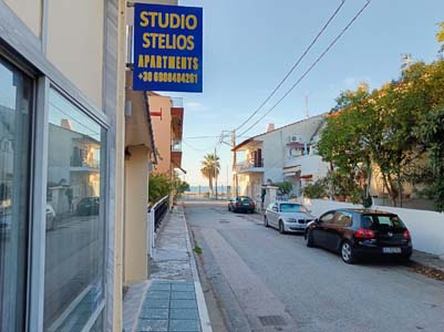 Vila Stelios je starijeg datuma i sastoji se od četvorokrevetnih apartmana na visokom prizemlju i studija na prvom spratu. Nalazi se u centru letovališta na oko 80 metara od mora. Dvokrevetni, trokrevetni i četvorokrevetni apartmani na visokom prizemlju sadrže kuhinju sa trpezarijskim stolom i jednim standardnim ležajem, spavaću sobu sa francuskim i standardnim  ležajem, kupatilo sa tuš kadom i veliku natkrivenu terasu sa garniturom za sedenje i pogledom na dvorište. Veličina apartmana je cca 25 kvm + terasa. Opremljen je sa wi – fi Internetom, TV-om, mrežom za komarce i klima uredjajem (uključen u cenu) u spavaćoj sobi. Četvorokrevetni studio na prvom spratu sadrži kuhinjski deo, francuski ležaj i dva standardna ležaja na sprat, kupatilo sa tuš kadom i veliku natkrivenu terasu sa garniturom za sedenje i bočnim pogledom na more. Veličina studija je cca 24 kvm + terasa. Opremljen je sa wi – fi Internetom, TV-om, mrežom za komarce i klima uredjajem (uključen u cenu). Ono što posebno izdvaja ovaj studio i čini ga izuzetno atraktivnim i interesantnim, je velika ugaona terasa (oko 15 kvadrata), sa prelepim bočnim pogledom na more. Vila Stelios je B kategorije, nema peškire, a parkiranje je moguće na ulici pored vile.