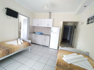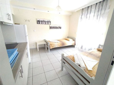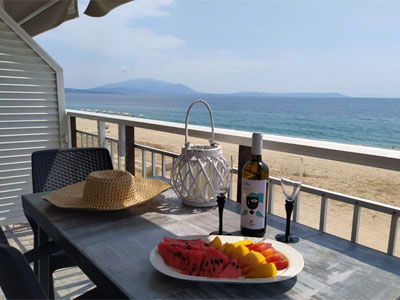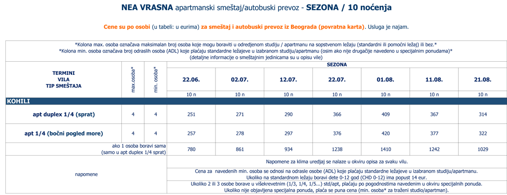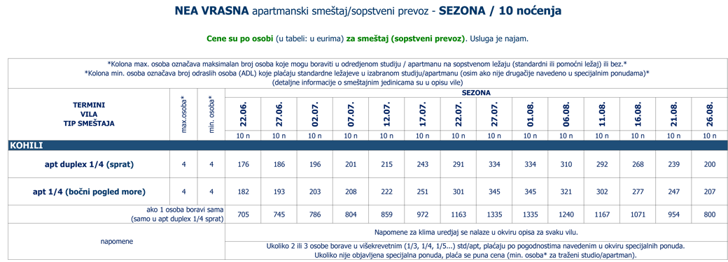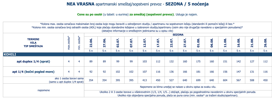 Vila Kohili se nalazi na samoj plaži, nedaleko od centra Nea Vrasne koja je šetalištem uz more (petnaestak minuta šetnje) spojena sa Asprovaltom. U neposrednoj blizini se nalaze brojne taverne, kafići, prodavnice... Zahvaljujući svojoj izuzetnoj poziciji, kao i porodičnim apartmanima na izdignutom prizemlju, prvom i drugom spratu, idealna je upravo za porodice sa decom. Četvorokrevetni dupleks apartmani (drugi sprat) pored opremljene kuhinje, imaju dve spavaće sobe sa po francuskim ležajem, kupatilo i lepu veliku terasu sa garniturom za sedenje, sa pogledom na šetalište. Četvorokrevetni apartman (drugi sprat) u vili Kohili sastoji se od prostorije u kojoj se nalazi kuhinja i dva standardna ležaja, spavaće sobe sa francuskim ležajem, kupatila i velike terase sa garniturom za sedenje i predivnim pogledom, bočno, na more i plažu. Svi apartmani su opremljeni sa po jednim klima uredjajem (uključen u cenu), wi - fi Internetom i TV - om. Veličina apartmana je cca od 30 do 35 kvm + terasa. Vila Kohili je B + kategorije, nema peškire i ima mogućnost parkinga u neposrednoj blizini. Opciono, u objektu se služi kontinentalni doručak uz doplatu na licu mesta: dnevno, odrasli 7 eura, deca od 2 - 12 godina 5 eura, kao i ručak, dnevni meni: dsnevno, odrasli I deca 10 eura. |
