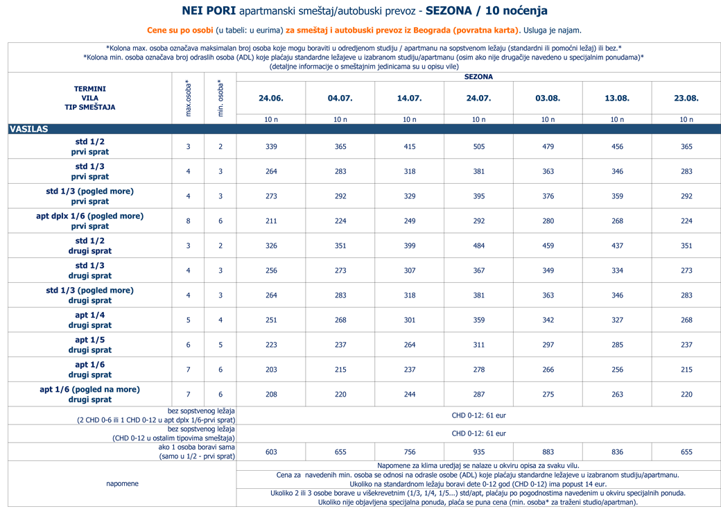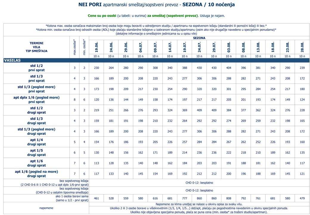Navedene cene se odnose na sve vile iz ponude izabranog mesta. Smeštaj u odredjenoj vili i tipu smeštaja zavisi od raspoloživih kapaciteta u momentu prodaje. Tipovi smeštaja (npr. studio, apartman, duplex, prizemlje, pogled more itd.) i maksimalan broj osoba (odraslih i/ili dece do odredjenog uzrasta) koje mogu boraviti u jednoj smeštajnoj jedinici su navedeni u okviru opisa i zvaničnog cenovnika za sezonu (pojedinačno za svaku vilu). |