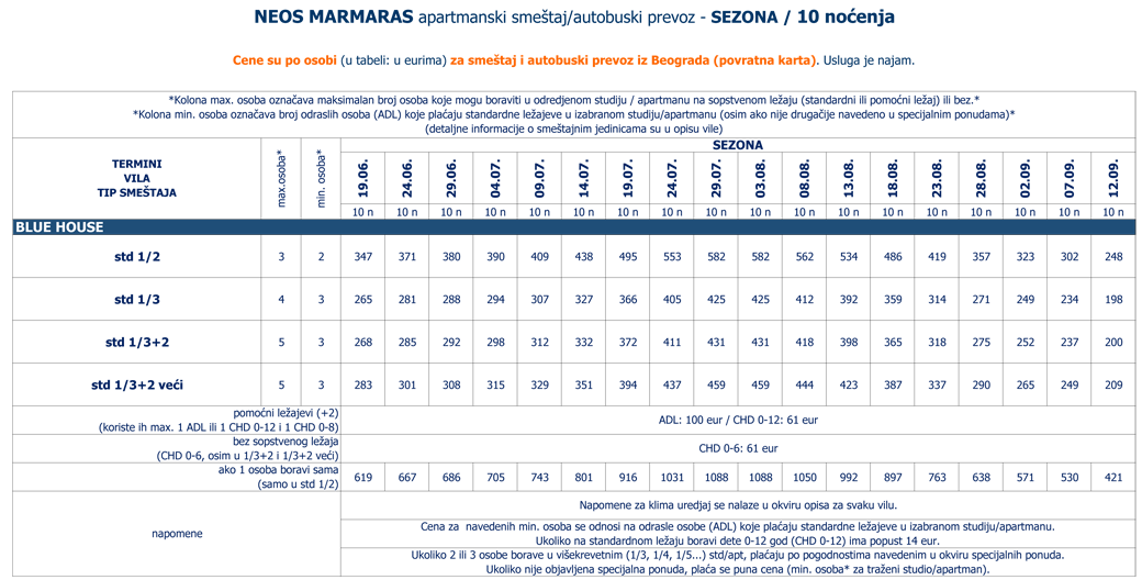 Cene su po osobi (u tabeli: u eurima) za smeštaj i autobuski prevoz iz Beograda (povratna karta).