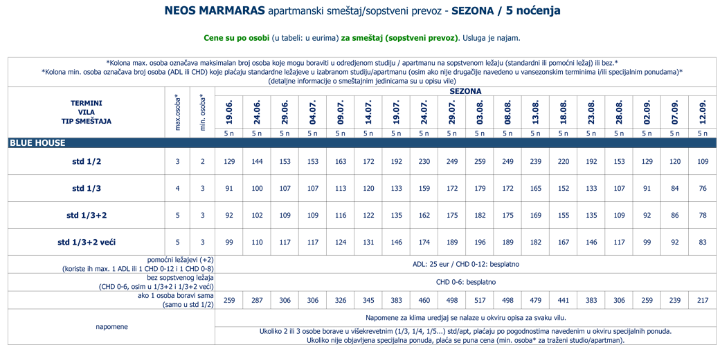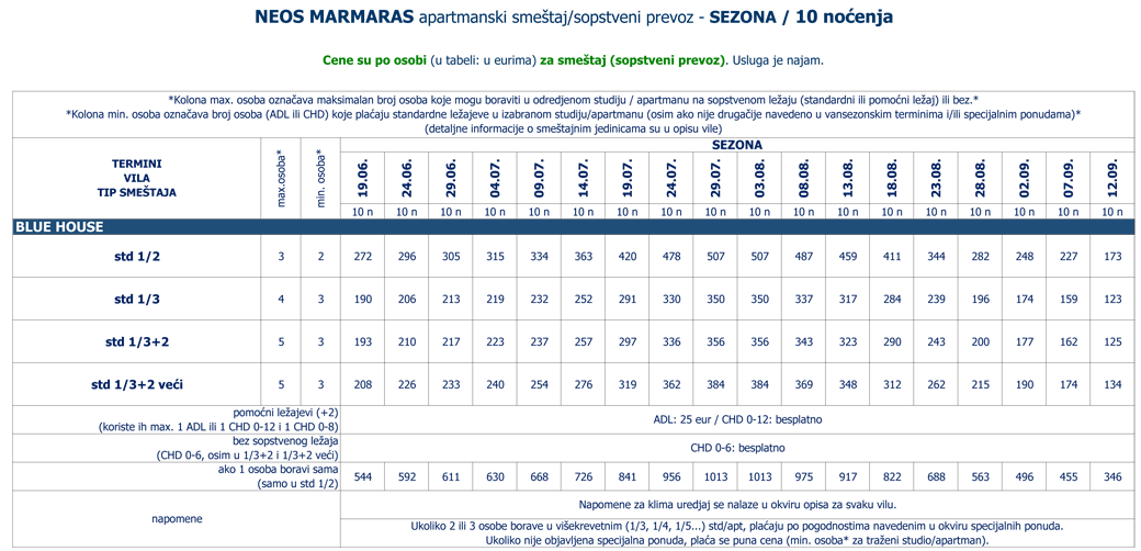 (cene za jednokrevetne std/apt, cene za odrasle (ADL) na pomoćnom ležaju i cene za decu (CHD) na sopstvenom (standardnom ili pomoćnom) ležaju ili bez su navedene u okviru POPUSTA i DOPLATA) |