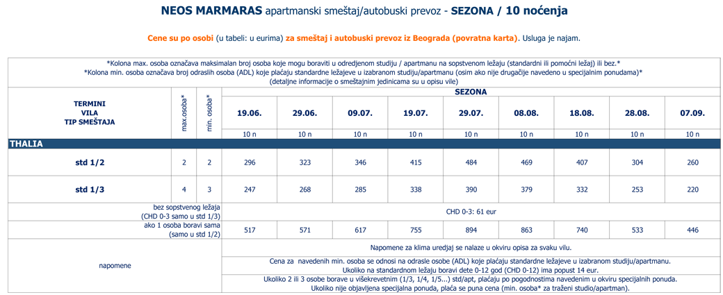 Cene su po osobi (u tabeli: u eurima) za smeštaj i autobuski prevoz iz Beograda (povratna karta).