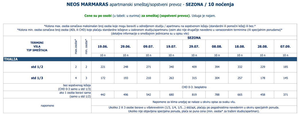 (cene za jednokrevetne std/apt, cene za odrasle (ADL) na pomoćnom ležaju i cene za decu (CHD) na sopstvenom (standardnom ili pomoćnom) ležaju ili bez su navedene u okviru POPUSTA i DOPLATA) |