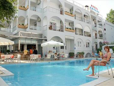 Lep mali hotel sa 60 soba, smešten je na nešto manje od sto metara od mora i centra letovališta. Kronos ima recepciju, lobi, restoran, wifi internet u javnim delovima hotela (besplatno), bazen, bar pored bazena, saunu (uz doplatu na licu mesta), teretanu (uz doplatu na licu mesta)... Suncobrani i ležaljke oko bazena su uključeni u cenu. Sve sobe su sa TWC sa fenom, SAT TV, telefonom, wi-fi Internetom (uz doplatu na licu mesta), malim frižiderom, A/C i terasom. Standardne sobe su namenjene za 2-3 osobe (2 standardna ili "francuski" ležaj i pomoćni ležaj). Porodične (family) sobe sa krevetima na sprat su namenjene za 2-4 osobe (2 standardna ili "francuski" ležaj i kreveti na sprat). Usluga u hotelu Kronos je polupansion – “švedski sto” - (samoposluživanje).
