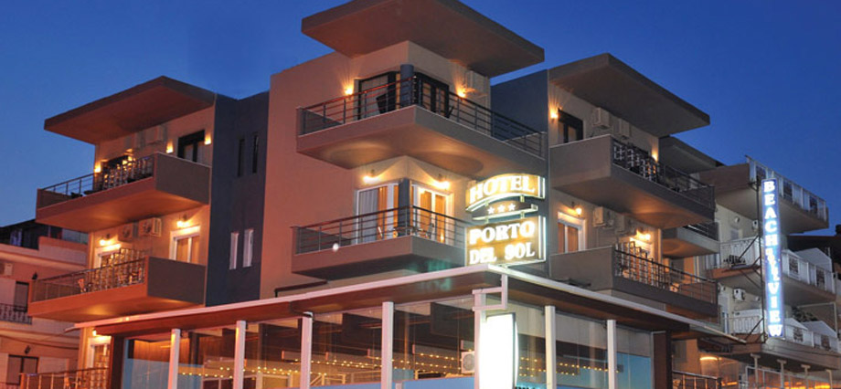 Hotel Porto del Sol se nalazi u Paraliji, pored marine i na manje od 100 metara od najlepšeg dela plaže u letovalištu. Hotel ima recepciju, wifi internet u javnim delovima hotela (besplatno), bar/restoran i parking. Sve sobe imaju TWC sa fenom, A/C, SAT TV, telefon, wi-fi Internet (besplatno), frižider, sef (besplatno) i terasu. Standardne sobe su namenjene za 2-3 osobe (2 standardna ili "francuski" ležaj i pomoćni ležaj). Superior sobe su renovirane (2010. god.) i veće su kvadrature od standardnih soba. Usluga u hotelu Porto del Sol je noćenje sa doručkom – “švedski sto” (samoposluživanje) uz mogućnost doplate za polupansion: večera - meni.
