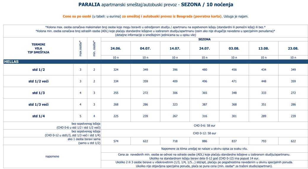 Ukoliko jedna osoba boravi sama u 1/3+1, 1/4, 1/5, 1/6... std/apt plaća 2 cene iz kolone broj osoba za 3 ADL: 1 cenu iz tabele za autobuski i 1 iz tabele za sopstveni prevoz. |