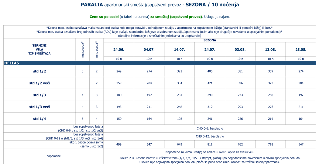 (cene za jednokrevetne std/apt, cene za odrasle (ADL) na pomoćnom ležaju i cene za decu (CHD) na sopstvenom (standardnom ili pomoćnom) ležaju ili bez su navedene u okviru POPUSTA i DOPLATA) |