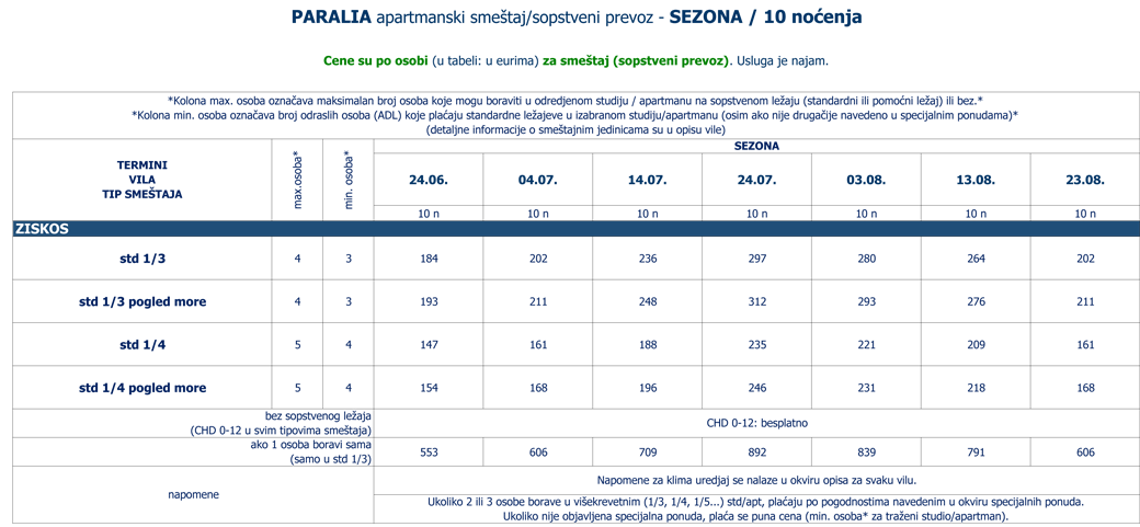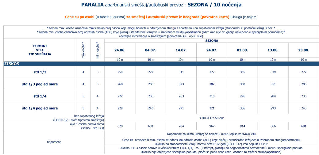 Vila Ziskos, starijeg je datuma i nalazi se na plaži, u centru Paralije, 100 metara levo od crkve. Sabra u ovoj vili ima studije na drugom spratu sa pogledom na more ili ulicu/šetalište. Trokrevetni i četvorokrevetni, veliki, lepi prostrani studiji kompletno renovirani pre nekoliko godina, sastoje se iz dela za spavanje u okviru kojeg se nalaze standardni i/ili francuski ležajevi, dela sa opremljenom kuhinjom, kupatila i lepe terase sa tendom i garniturom za sedenje. Opremljeni su plazma TV – om (jedan srpski kanal), klima uredjajem (uz doplatu na licu mesta (opcija), 7 eura dnevno po studiju) i bežičnim internetom. Veličina studija je cca 22 - 25 kvm + terasa. Ukoliko se odlučite za ovu vilu, odabrali ste jednu od najbolje pozicioniranih vila u Paraliji. Vila Ziskos je B kategorije, nema peškire i nema mogućnost sopstvenog parkinga (parkiranje na ulici ispred vile). Postoji mogućnost uplate polupansiona (uz doplatu na licu mesta) nedaleko od vile, u hotelu Hellas. U vili, u prizemlju se nalazi i predstavnistvo Sabra travel, u kojoj se često nalazi i vlasnik vile koji odlično govori srpski. |