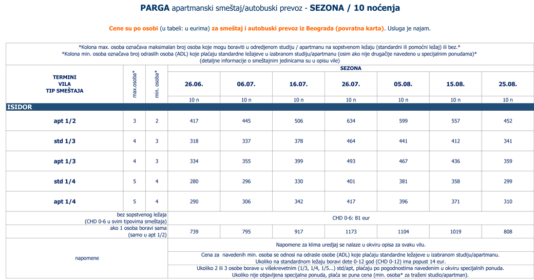 Cene su po osobi (u tabeli: u eurima) za smeštaj i autobuski prevoz iz Beograda (povratna karta).