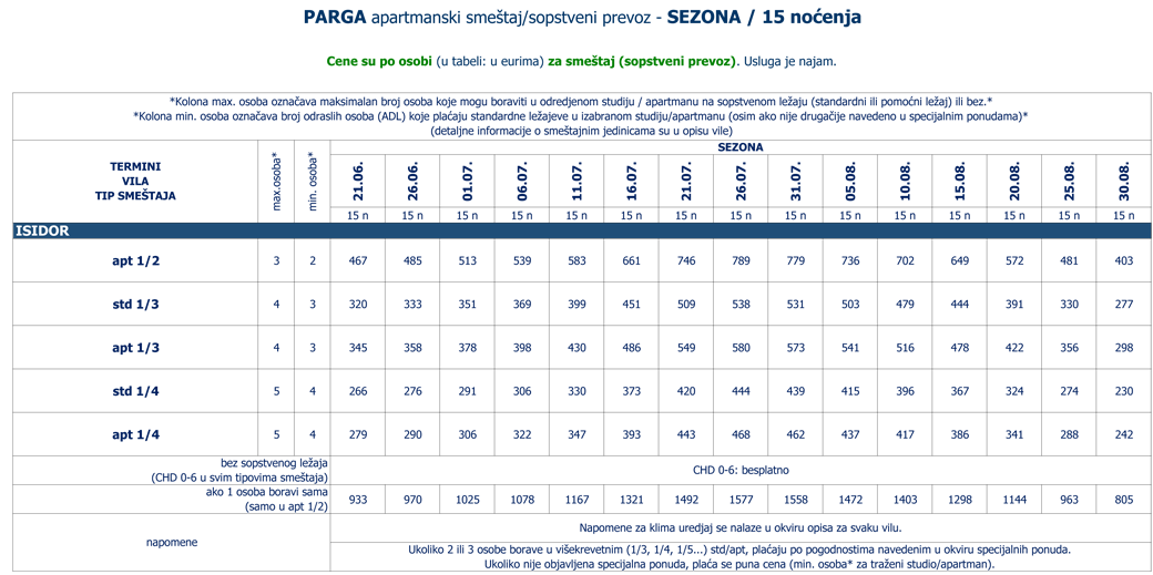 Navedene cene se odnose na sve vile iz ponude izabranog mesta. Smeštaj u odredjenoj vili i tipu smeštaja zavisi od raspoloživih kapaciteta u momentu prodaje. Tipovi smeštaja (npr. studio, apartman, duplex, prizemlje, pogled more itd.) i maksimalan broj osoba (odraslih i/ili dece do odredjenog uzrasta) koje mogu boraviti u jednoj smeštajnoj jedinici su navedeni u okviru opisa i zvaničnog cenovnika za sezonu (pojedinačno za svaku vilu). |