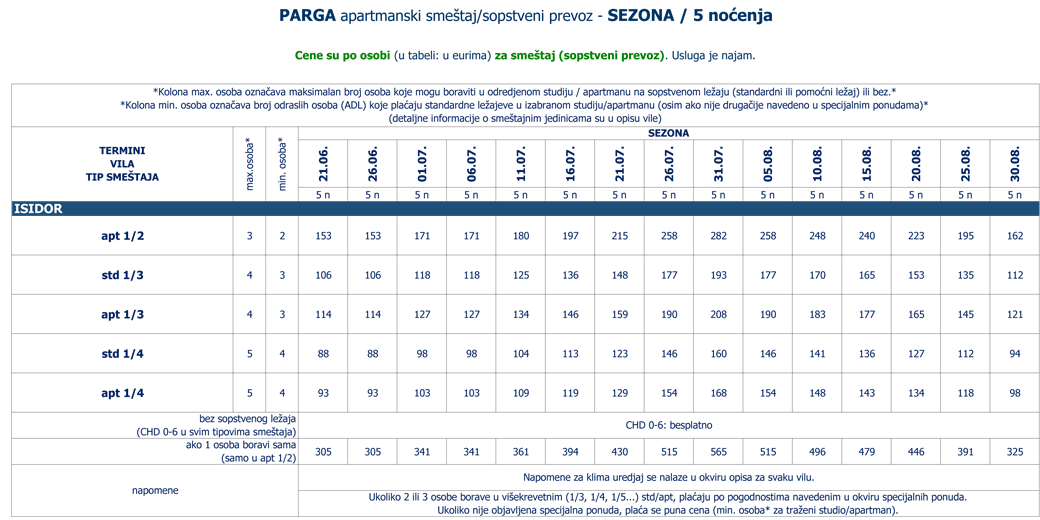 Cene su po osobi (u tabeli: u eurima) za smeštaj (sopstveni prevoz).