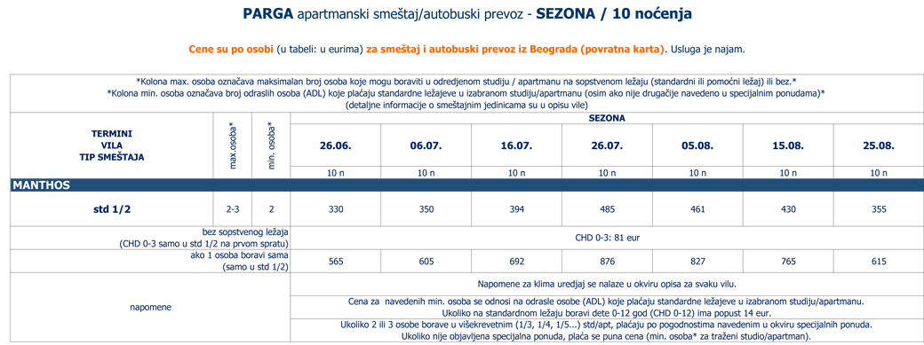Ukoliko jedna osoba boravi sama u 1/3+1, 1/4, 1/5, 1/6... std/apt plaća 2 cene iz kolone broj osoba za 3 ADL: 1 cenu iz tabele za autobuski i 1 iz tabele za sopstveni prevoz. |