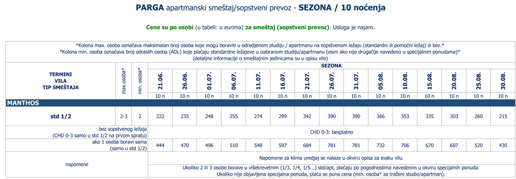 Cene su po osobi (u tabeli: u eurima) za smeštaj (sopstveni prevoz).