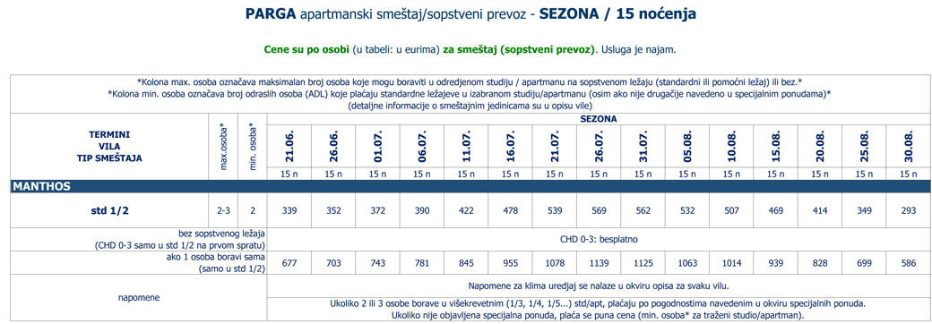 Navedene cene se odnose na sve vile iz ponude izabranog mesta. Smeštaj u odredjenoj vili i tipu smeštaja zavisi od raspoloživih kapaciteta u momentu prodaje. Tipovi smeštaja (npr. studio, apartman, duplex, prizemlje, pogled more itd.) i maksimalan broj osoba (odraslih i/ili dece do odredjenog uzrasta) koje mogu boraviti u jednoj smeštajnoj jedinici su navedeni u okviru opisa i zvaničnog cenovnika za sezonu (pojedinačno za svaku vilu). |