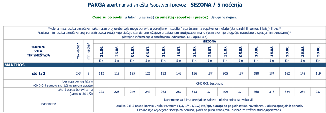Odlična vila Mantos se nalazi se na obodu Parge, malo iznad centra, okružena zelenilom, udaljena od pešačke zone nekoliko minuta hoda, ili na oko 450 metara i na oko 700 metara od gradske, Krioneri plaže. I ostale plaže koje okružuju Pargu su na pešačkoj distanci. Dobra lokacija vile, blizina grada, taverni i prodavnica, bitno će doprineti kvalitetu boravka u Pargi. Vila Mantos se sastoji od dvokrevetnih studija na prvom i drugom spratu. Opremljeni su klima uradjem (uz doplatu na licu mesta (opcija) 7 eura dnevno po studiju), wi - fi Internetom, TV – om. Sve terase su sa bočnim pogledom na grad i more. Pored kuhinjskog dela, studiji sadrže dva standardna ležaja koja se mogu transformisati u bračni, kupatila i terase sa garniturom za sedenje i tendom. Veličina studija je cca 23 kvm + terasa. Vila Mantos je B kategorije, ima peškire i sopstveni, besplatni parking. NAPOMENA: u studijima na I spratu, deca do 3 godine mogu deliti ležaj sa dve odrasle osobe. Vilu preporučujemo parovima spremnim na uživanje u nezaboravnim zalascima sunca iznad gradske tvrdjave i mora. ODMOR 100%.