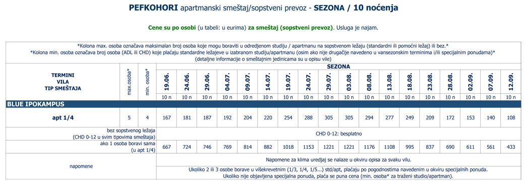 Navedene cene se odnose na sve vile iz ponude izabranog mesta. Smeštaj u odredjenoj vili i tipu smeštaja zavisi od raspoloživih kapaciteta u momentu prodaje. Tipovi smeštaja (npr. studio, apartman, duplex, prizemlje, pogled more itd.) i maksimalan broj osoba (odraslih i/ili dece do odredjenog uzrasta) koje mogu boraviti u jednoj smeštajnoj jedinici su navedeni u okviru opisa i zvaničnog cenovnika za sezonu (pojedinačno za svaku vilu). |