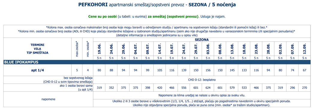 Ukoliko jedna osoba boravi sama u 1/3+1, 1/4, 1/5, 1/6... std/apt plaća 2 cene iz kolone broj osoba za 3 ADL: 1 cenu iz tabele za autobuski i 1 iz tabele za sopstveni prevoz. |