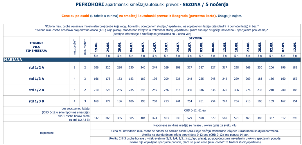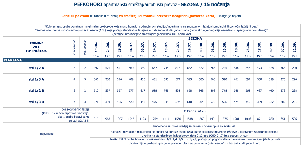 Cene su po osobi (u tabeli: u eurima) za smeštaj i autobuski prevoz iz Beograda (povratna karta).