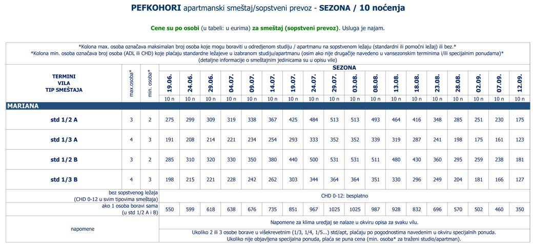 Navedene cene se odnose na sve vile iz ponude izabranog mesta. Smeštaj u odredjenoj vili i tipu smeštaja zavisi od raspoloživih kapaciteta u momentu prodaje. Tipovi smeštaja (npr. studio, apartman, duplex, prizemlje, pogled more itd.) i maksimalan broj osoba (odraslih i/ili dece do odredjenog uzrasta) koje mogu boraviti u jednoj smeštajnoj jedinici su navedeni u okviru opisa i zvaničnog cenovnika za sezonu (pojedinačno za svaku vilu). |