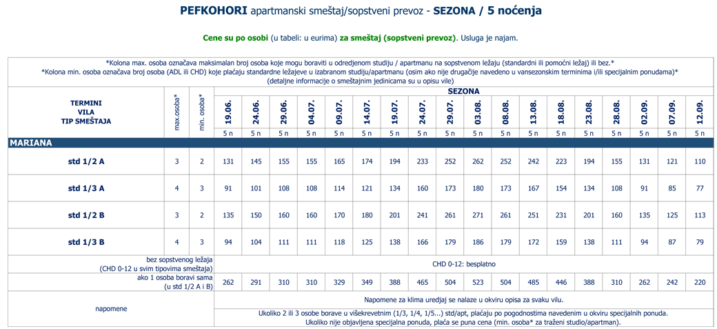 (cene za jednokrevetne std/apt, cene za odrasle (ADL) na pomoćnom ležaju i cene za decu (CHD) na sopstvenom (standardnom ili pomoćnom) ležaju ili bez su navedene u okviru POPUSTA i DOPLATA) |