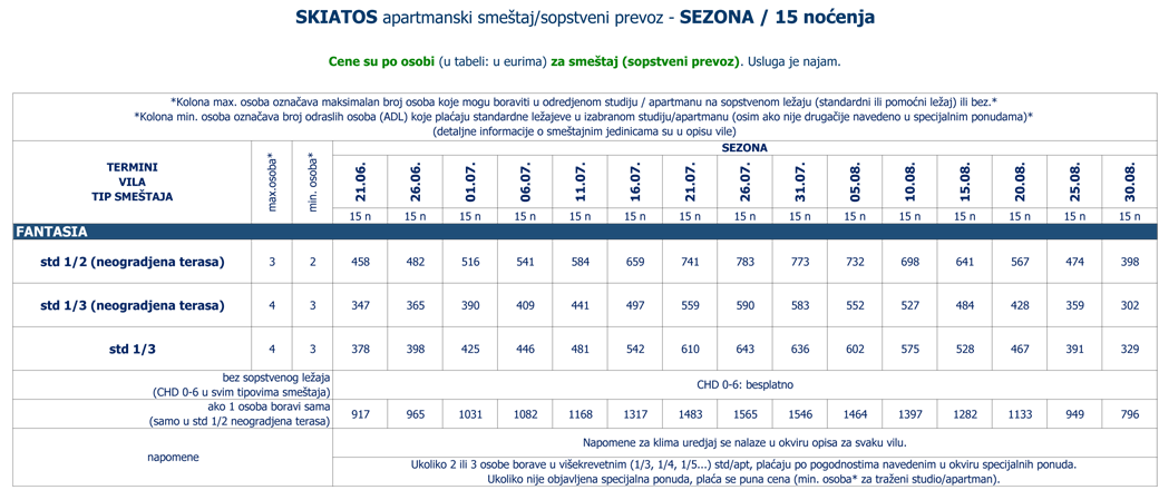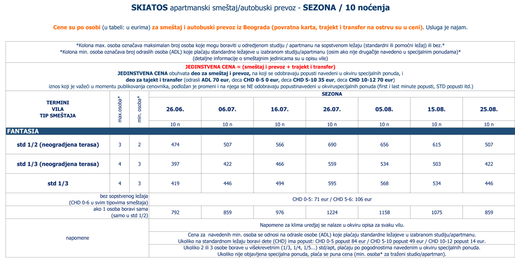 Cene su po osobi (u tabeli: u eurima) za smeštaj i autobuski prevoz iz Beograda (povratna karta, trajekt je u ceni).