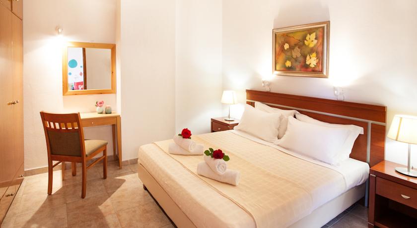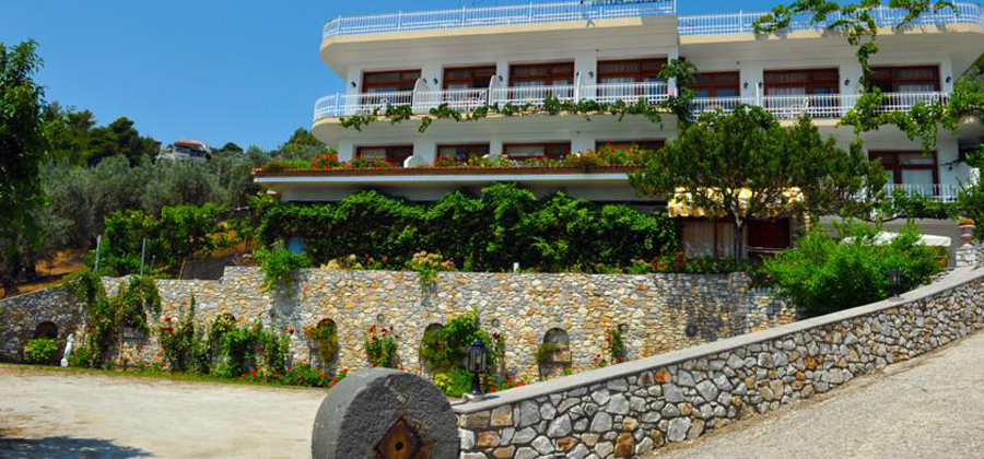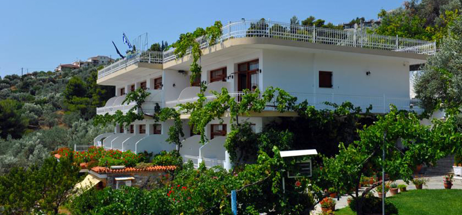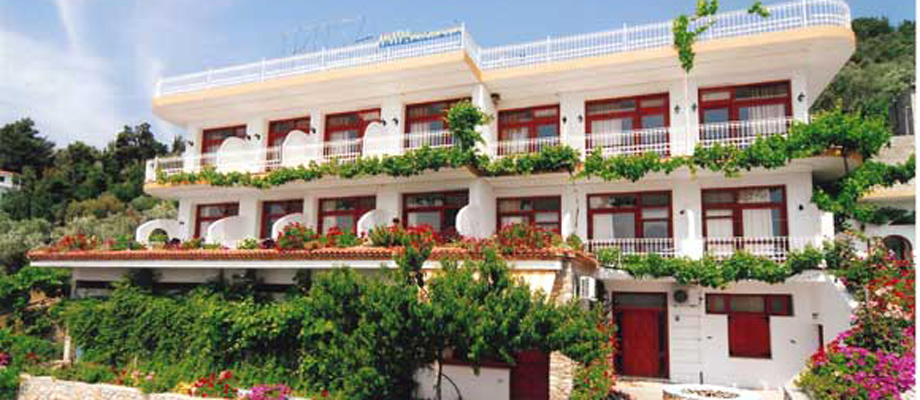 Hotel se nalazi na oko 1 kilometar od grada Skiatosa, na oko 100 metara od plaže Megali Amos. Sadržaj hotela: recepcija, sefovi na recepciji (uz doplatu na licu mesta), wifi internet u javnim delovima hotela (besplatno), sala za doručak, parking… Sve sobe imaju TWC, mali frižider, TV, A/C i terasu sa pogledom na more. Standardne sobe su veličine cca 20 kvm, namenjene su za 2 osobe (2 standardna ležaja ili "francuski ležaj"). Superior sobe su veličine cca 25 kvm, namenjene su za 2-3 osobe (2 standardna ležaja ili "francuski ležaj" i pomoćni ležaj). Porodične (family) sobe su veličine cca 30kvm i namenjene su za 2-4 osobe (2 standardna ležaja ili "francuski ležaj" i sofa). Usluga u hotelu je noćenje sa doručkom - “švedski sto” (samoposluživanje).