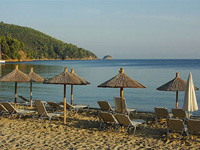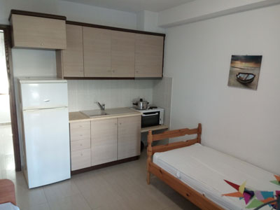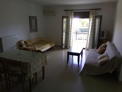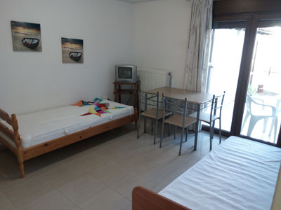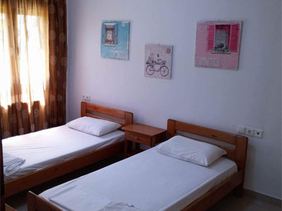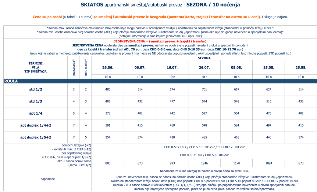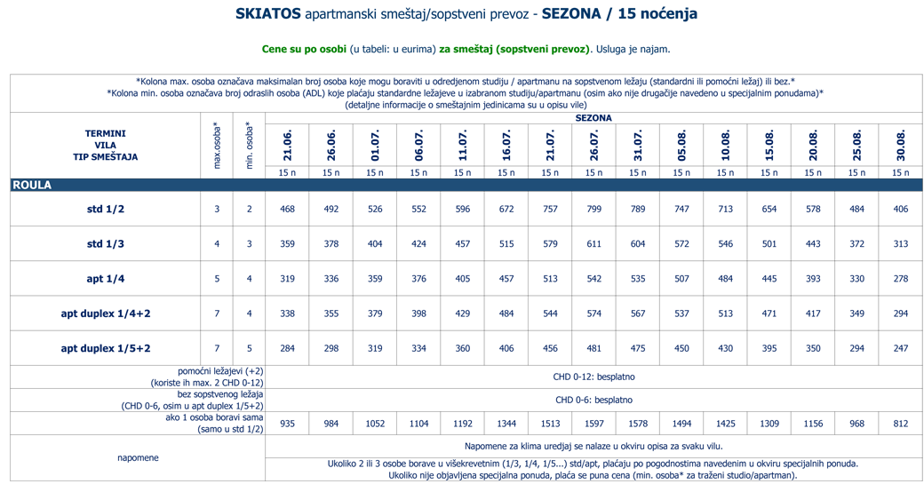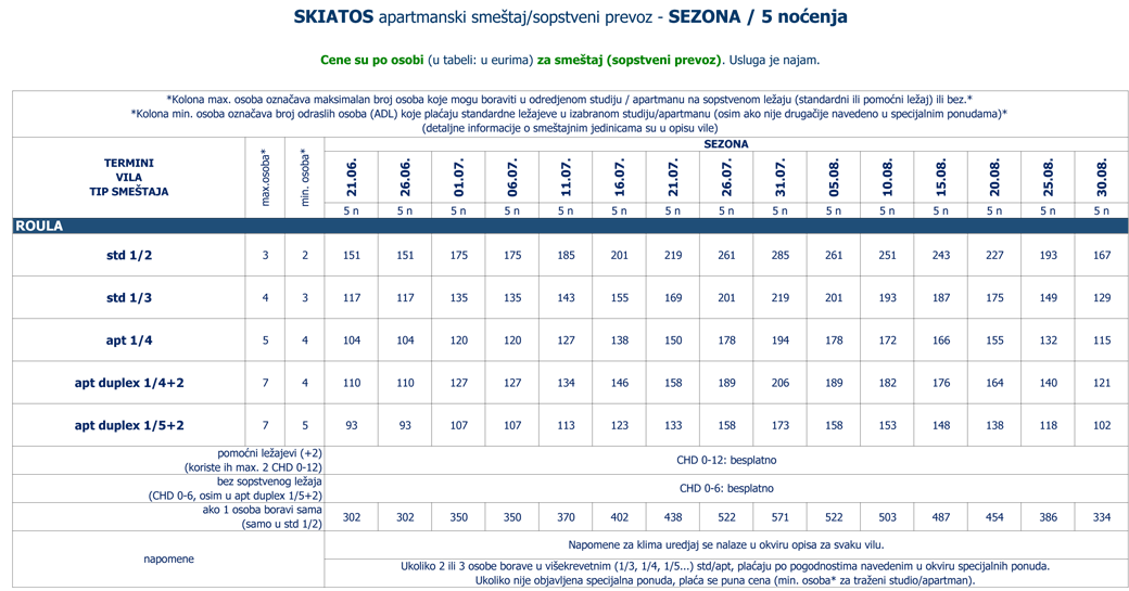 Vila Roula je novijeg datuma i nalazi u gradu Skiatosu, na oko 700 metara od strogog centra i oko 150 metara od najbliže autobuske stanice. Od najbliže plaže, Megali Amos, je nešto manje od oko 900 metara ili 2 autobuske stanice. Vila Roula je smeštena u lepom dvorištu sa zelenilom i cvećem. Dvokrevetni i trokrevetni studiji su na prizemlju, četvorokrevetni apartmani na prizemlju i prvom spratu, a prelepi četvorokrevetni+2 i petokrevetni+2 dupleks apartmani se nalaze na prvom spratu. Studiji sadrže opremljenu kuhinju, deo za spavanje s francuskim, odnosno tri standardna ležaja, kupatilo i lepe velike terase sa garniturom za sedenje u prirodnoj hladovini i zelenilu. Veličina studija je cca 20 - 23 kvm + terasa. Četvorokrevetni apartman se sastoji od sobe u kojoj je kuhinja i dva standardna ležaja, spavaće sobe sa dva standardna ležaja, kupatila i terase s garniturom za sedenje, odnosno dela dvorišta s garniturom za sedenje. Veličina apartmana je cca 30 kvm + terasa. Četvorokrevetni+2 i petokrevetni+2 dupleks apartmani se sastoje od dnevnog boravka s kuhinjom i trpezarijom u kojoj je klima uredjaj i TV, dve spavaće sobe sa po francuskim i dva standardna ležaja, kupatila i lepe, velike terase s garniturom za sedenje. Petokrevetni dupleks u dnevnoj sobi ima dodatni standardni ležaj i sofu na otvaranje na kojoj može da spava dvoje dece do 12 godina, (što ima i četvorokrevetni+2). Veličina apartmana je cca 45 kvm + terasa. Svi studiji i apartmani su opremljeni TV – om, wi – fi Internetom i klima uredjajem (uz doplatu na licu mesta (opcija), 8 eura dnevno po studiju/apartmanu). Vila Roula je B + kategorije, ima peškire i ima mogućnost sopstvenog parkinga. Najbliži mini market je udaljen oko 120 metara. |