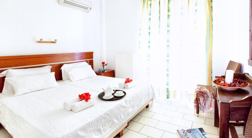 Hotel se nalazi na oko 1.5 kilometar od grada Skiatosa i na oko 2 kilometra od plaže Megali Amos. Na 50 metara se nalazi stanica mini busa koji vozi do luke, a od glavne autobuske stanice (odakle su polasci za plaže) hotel je udaljen oko 1 kilometar. Sadržaj hotela: recepcija, sefovi na recepciji (besplatno), wifi internet u javnim delovima hotela (besplatno), sala za doručak, bazen, bar pored bazena, parking… Sve sobe imaju TWC, mini bar, TV, A/C i terasu (sobe u prizemlju imaju verandu). Standardne sobe su veličine cca 20-25 kvm, imaju pogled na baštu i na bazen, namenjene su za 2-3 osobe (2 standardna ležaja ili "francuski ležaj" i sofa).  Superior sobe su veličine cca 22-27 kvm, imaju pogled na more i na bazen , namenjene su za 2-3 osobe (2 standardna ležaja ili "francuski ležaj" i sofa). Suite su namenjene za 2-4 osobe i sastoje se iz spavaće sobe (2 standardna ležaja ili "francuski ležaj") i dnevnog boravka (2 sofe). Usluga u hotelu je noćenje sa doručkom  - kontinentalni doručak.