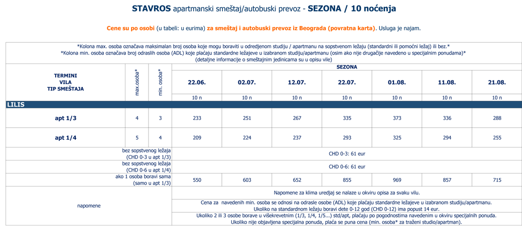 Cene su po osobi (u tabeli: u eurima) za smeštaj i autobuski prevoz iz Beograda (povratna karta).