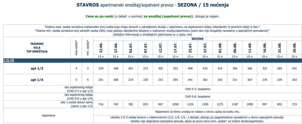 Navedene cene se odnose na sve vile iz ponude izabranog mesta. Smeštaj u odredjenoj vili i tipu smeštaja zavisi od raspoloživih kapaciteta u momentu prodaje. Tipovi smeštaja (npr. studio, apartman, duplex, prizemlje, pogled more itd.) i maksimalan broj osoba (odraslih i/ili dece do odredjenog uzrasta) koje mogu boraviti u jednoj smeštajnoj jedinici su navedeni u okviru opisa i zvaničnog cenovnika za sezonu (pojedinačno za svaku vilu). |