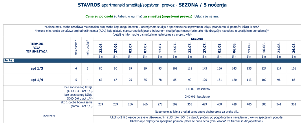 *Kolona broj osoba označava broj odraslih osoba (ADL) koje plaćaju standardne ležajeve u izabranom studiju/apartmanu*