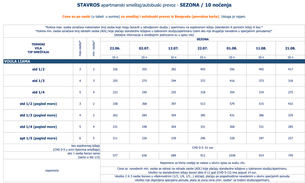 Cene su po osobi (u tabeli: u eurima) za smeštaj i autobuski prevoz iz Beograda (povratna karta).