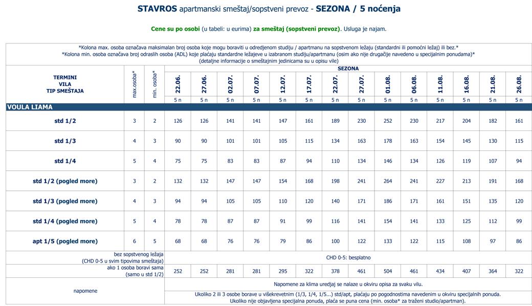 *Kolona broj osoba označava broj odraslih osoba (ADL) koje plaćaju standardne ležajeve u izabranom studiju/apartmanu*