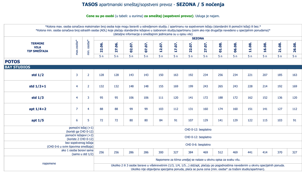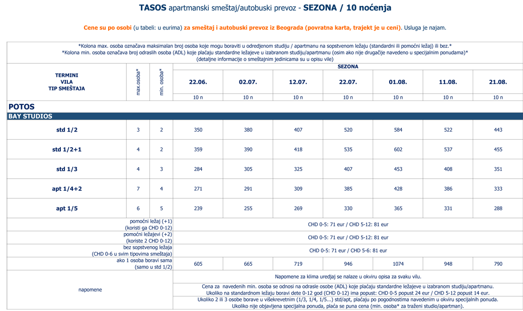 Cene su po osobi (u tabeli: u eurima) za smeštaj i autobuski prevoz iz Beograda (povratna karta, trajekt je u ceni).