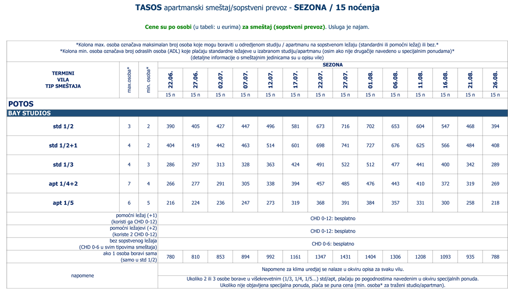 Navedene cene se odnose na sve vile iz ponude izabranog mesta. Smeštaj u odredjenoj vili i tipu smeštaja zavisi od raspoloživih kapaciteta u momentu prodaje. Tipovi smeštaja (npr. studio, apartman, duplex, prizemlje, pogled more itd.) i maksimalan broj osoba (odraslih i/ili dece do odredjenog uzrasta) koje mogu boraviti u jednoj smeštajnoj jedinici su navedeni u okviru opisa i zvaničnog cenovnika za sezonu (pojedinačno za svaku vilu). |