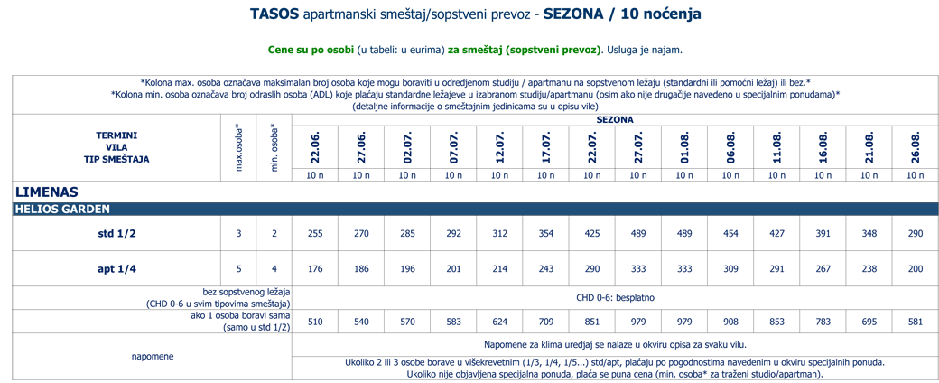 Cene su po osobi (u tabeli: u eurima) za smeštaj i autobuski prevoz iz Beograda (povratna karta, trajekt je u ceni).