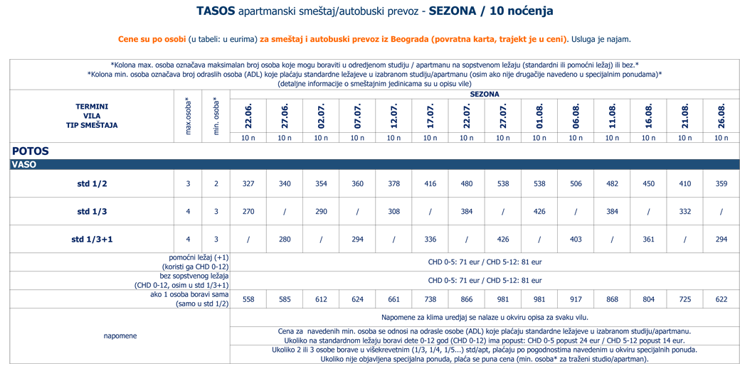 Cene su po osobi (u tabeli: u eurima) za smeštaj i autobuski prevoz iz Beograda (povratna karta, trajekt je u ceni).