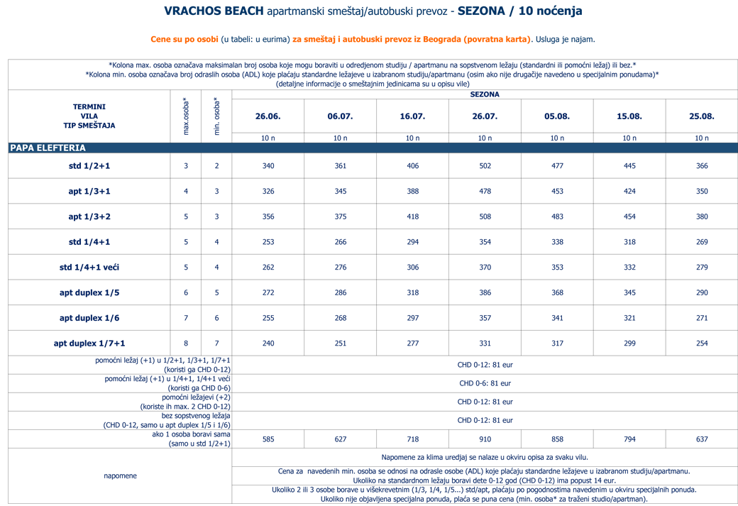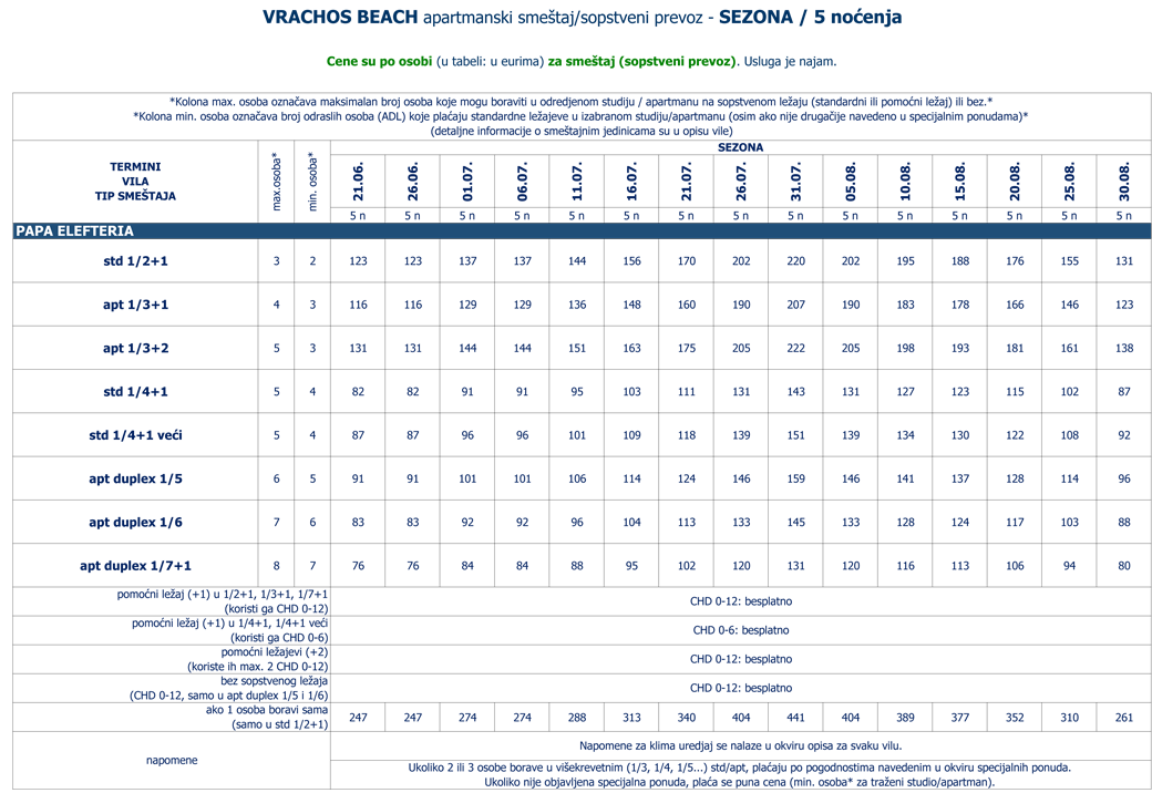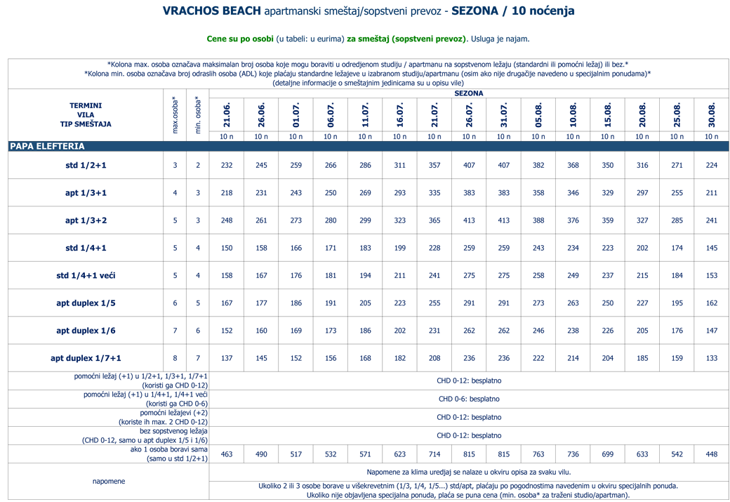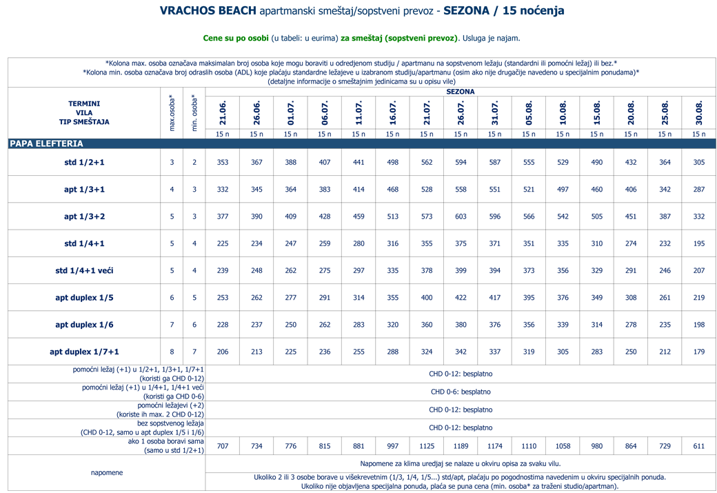 Nalazi se u centru letovališta, malo “uvučena” od šetališta i plaže (izolovana od buke i gradske vreve). Od peščane plaže je udaljena manje od 50 metara, od koje je deli susedna vila Papa Nikos i šetalište. Vila Papa Eleftheria, sa svojim odličnim studijima, porodičnim apartmanom sa izlazom u vrt, divnim velikim duplex apartmanom i lepim malim vrtom, u neposrednoj blizini plaže, predstavlja odličan razlog zašto je baš ova vila pravi izbor u Vrachos Beach-u. Lepi, prostrani, dobro opremljeni studiji nalaze se na drugom spratu i imaju divan pogled na more ili dvorište sa bočnim pogledom na more. Dvokrevetni + 1 studio se sastoji od dela sa kuhinjom, francuskim ležajem, ima fotelju na otvaranje, kupatila i terase sa garniturom za sedenje. Veličina studija je cca 18 kvm + terasa. Četvorokrevetni + 1 studio se sastoji od dela sa kuhinjom, dela u kojem je francuski ležaj i manjim dvosedom na otvaranje na kojem može spavati odrasla osba, galerije sa nižim, kosim krovom na kojoj je madrac širine manjeg francuskog ležaja, kupatila i terase sa garniturom za sedenje i pogledom na more. Četvorokrevetni + 1 veći studio umesto dvoseda ima standardni ležaj i nešto je veći od prethodno opisanog. Veličina studija je cca 23 kvm, odnosno cca 25 kvm + terasa sa garniturom za sedenje i pogledom na more. Trokrevetni +1 i trokrevetni + 2 apartman u prizemlju u koji se ulazi kroz terasu, ima pogled na more i predstavlja pravi izbor za porodice sa malom decom, jer pored sopstvene terase, ima na raspolaganju i dvorište/vrt. Sastoji se od ulazne sobe u kojoj se nalazi kuhinja (veliki frižider sa zamrzivačem i malim šporetom sa rernom), mali sto za ručavanje, standardni ležaj (sofa) i pomoćni na izvlačenje (skoro kao pravi), spavaće sobe sa francuskim ležajem i foteljom na otvaranje (za dete do 12 godina), kupatila sa fenom (ulaz iz spavaće sobe) i terase sa garniturom za sedenje. Spavaća soba nema prozor (osim malog koji se otvara na ulazni hodnik ka spratovima). Veličina apartmana je cca 28 kvm + terasa. Sedmokrevetni + 1 duplex apartman, jedini na prvom spratu, veličine je cca 65 kvm + terasa cca 20 kvm sa garniturom za sedenje i pogledom na more. Sastoji se od dnevnog borvka sa standardnim ležajem i sofom na rasklapanje, odlično opremljene kuhinje (šporet i veliki frižider sa zamrzivačem) sa standardnim ležajem, dve spavaće sobe (dva standardna ležaja i manji francuski + standardni) i kupatila. Petokrevetni i šestokrevetni duplex apartman se razlikuju samo po broju ležajeva u odnosu na prethodno opisani. Studiji i apartman su opremljeni klima uredjajem (uz doplatu na licu mesta (opcija) 7 eura, osim dupleks apartmana na prvom spratu 10 eura), TV-om, wi – fi Internetom i jednom zajedničkom veš mašinom (uz doplatu na licu mesta). Vila Papa Eleftheria je B + kategorije, ima peškire i mogućnost parkinga na ulici pored plaže. |